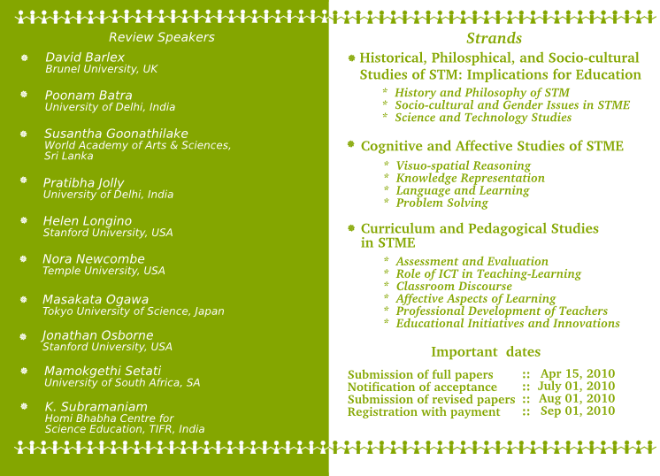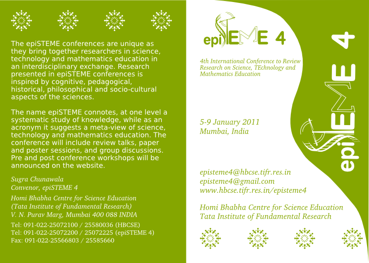 The name epiSTEME connotes, at one level, a systematic study of knowledge, while as an acronym it suggests a meta-view of science, technology and mathematics education. epiSTEME 4 conference will include review talks, paper and poster sessions and group discussions.
